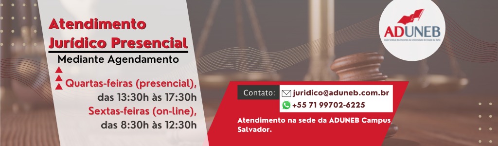 Docentes que necessitem agendar atendimento deverão entrar em contato pelo whatsapp 71997026225 ou pelo e-mail juridico@aduneb.com.br de segunda a sexta-feira, das 8h às 12h; com exceção das quartas-feiras, cujo horário segue das 13h30 às 17h30.