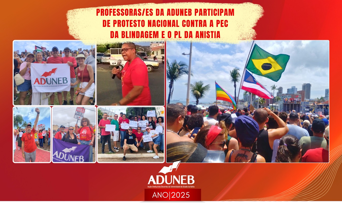Professoras e professores da ADUNEB somaram suas vozes à indignação de milhares de pessoas do país e foram às ruas neste histórico domingo (21). Os protestos aconteceram em todas as capitais, no Distrito Federal e em várias outras cidades, contra a Proposta de Emenda à Constituição (PEC) da Blindagem e a anistia aos golpistas de 8 de janeiro de 2023.