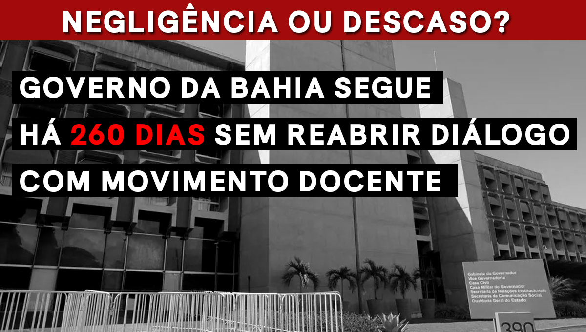 Há 260 dias, o governo da Bahia mantém paralisadas as negociações com o movimento docente das universidades estaduais, impedindo o avanço de pautas centrais da categoria. O último encontro ocorreu em 29 de julho de 2025 e, apesar de sinalizações do próprio governador em dezembro de 2025, não houve até o momento nenhuma retomada efetiva do diálogo.