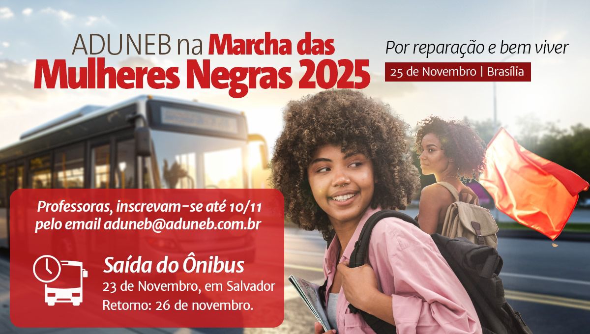Após dez anos da primeira marcha, no próximo dia 25 de novembro acontece a Marcha das Mulheres Negras 2025, que pretende reunir mais de um milhão de mulheres em luta na capital do país. A ADUNEB conclama as docentes da UNEB para participar desse momento histórico e extremamente necessário diante do cenário de desigualdades sociais e econômicas no qual as mulheres negras são as mais afetadas por violências como o feminicídio e a violência obstétrica, por exemplo. “A seção sindical se irmana à luta de mulheres negras de todo o Brasil e da América Latina e vai às ruas nessa segunda Marcha, em busca da reparação e pelo bem viver, tão necessários a nossas dignas existências”, destaca Karina Sales, Coordenadora Geral da ADUNEB.