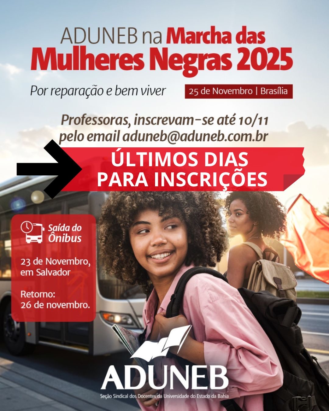 As inscrições para integrar a comitiva da ADUNEB para a Marcha das Mulheres Negras 2025 se encerram na próxima segunda-feira (10). A seção sindical disponibilizará um ônibus que sairá de Salvador para se somar à mobilização nacional, em Brasília. Para participar, envie até a data limite nome completo, RG, CPF e telefone para contato para o e-mail aduneb@aduneb.com.br. O ônibus com a comitiva sairá do Campus I, em Salvador, no dia 23 de novembro, com retorno no dia 26.
