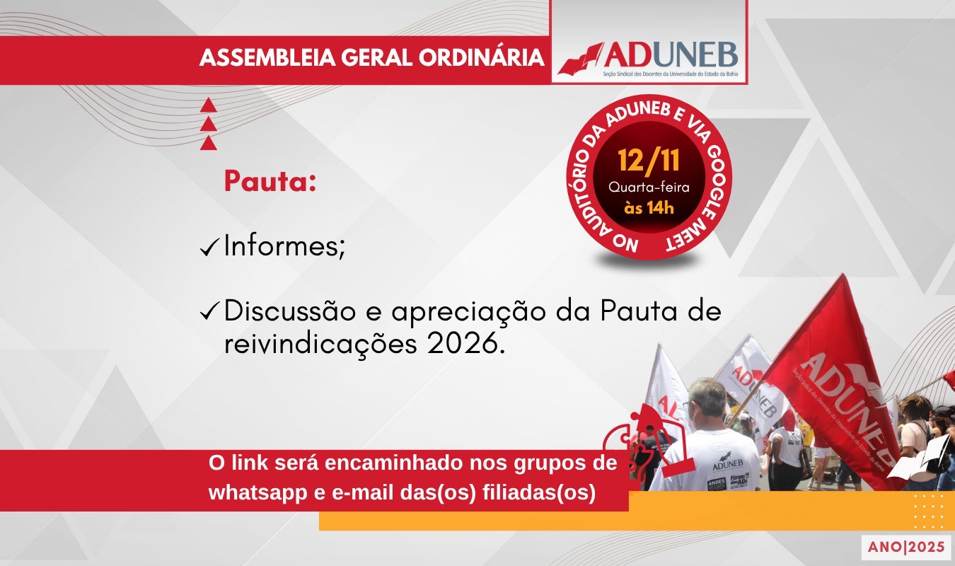 A Coordenação Executiva Colegiada da ADUNEB - SEÇÃO SINDICAL DOS DOCENTES DA UNIVERSIDADE DO ESTADO DA BAHIA, no uso de suas atribuições e de acordo com o que dispõe o seu Estatuto, convoca seus associados para uma ASSEMBLEIA GERAL ORDINÁRIA DOCENTE, a realizar-se no dia 12 de novembro de 2025 (quarta-feira), Auditório da ADUNEB – Salvador/BA, às 14h, em primeira convocação, e, às 14h30, em segunda convocação, com qualquer número de sindicalizados presentes.