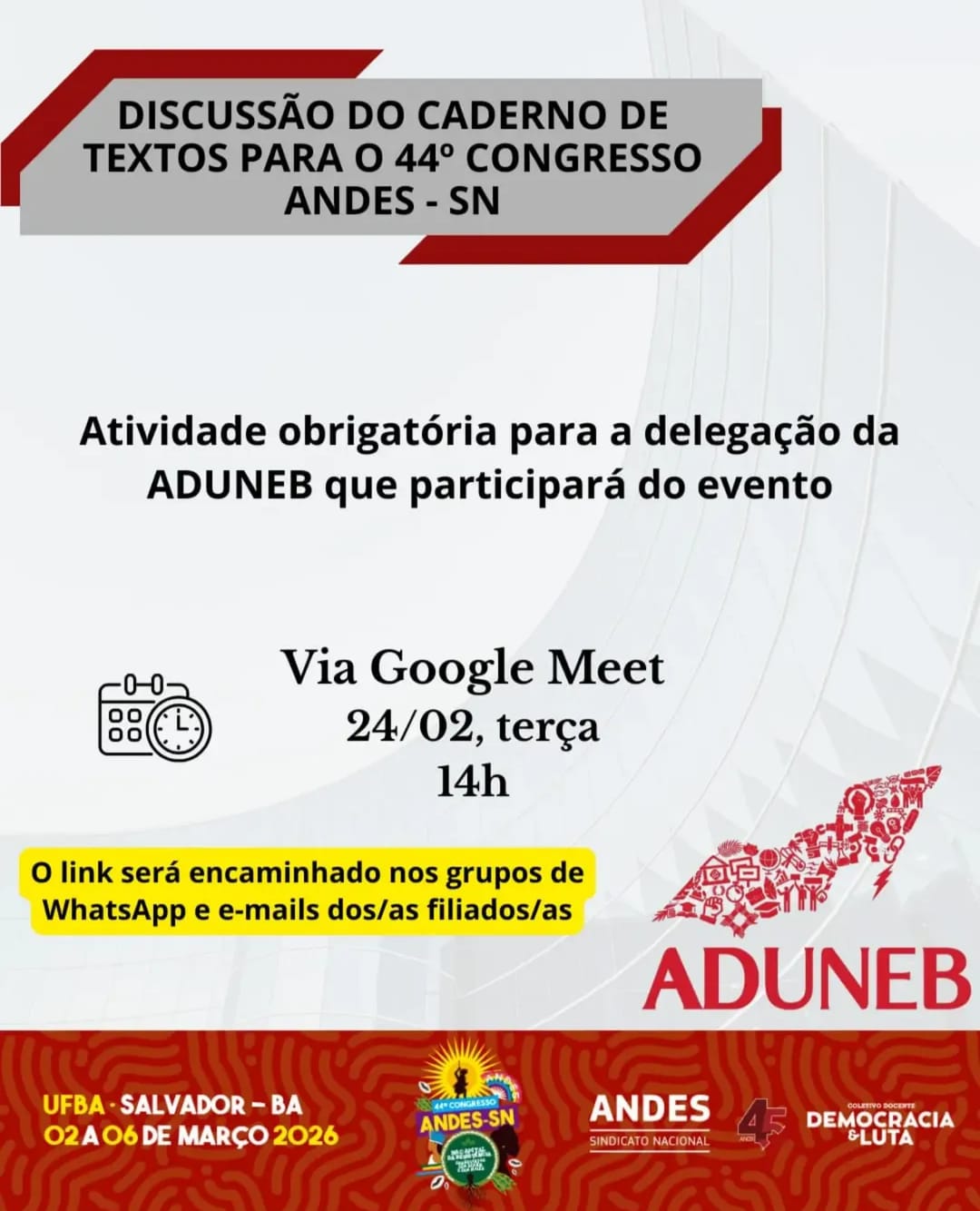 Para participar da reunião que discutirá o Caderno de Textos para o 44º Congresso do ANDES-SN, nesta terça-feira (24/02/26), às 14h, clique no link abaixo. A sala será aberta às 13h50.