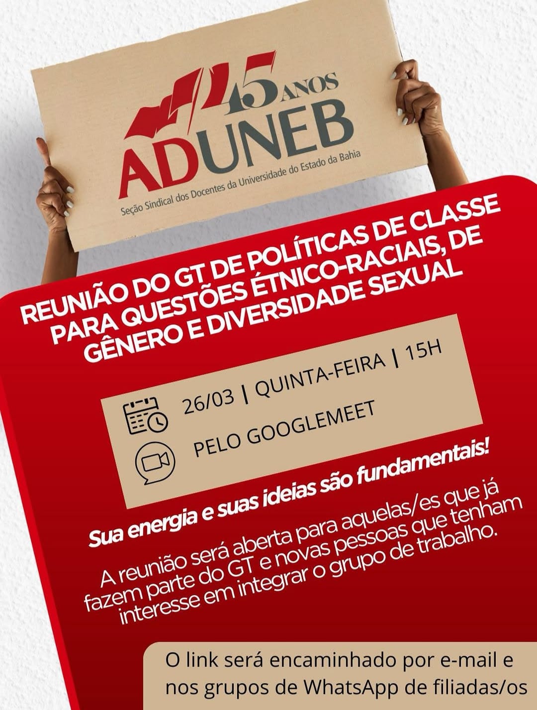 Para participar da reunião virtual do GT da ADUNEB sobre Políticas de Classe para Questões Étnico-Raciais, de Gênero e Diversidade Sexual, nesta quinta-feira (26), às 15h, clique no link: https://meet.google.com/mvr-srkx-wfe?authuser=1