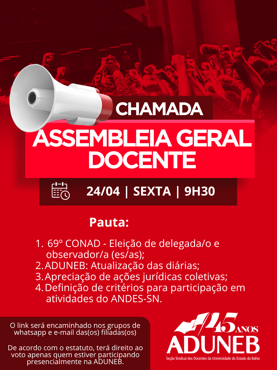 A Coordenação Executiva Colegiada da ADUNEB - SEÇÃO SINDICAL DOS DOCENTES DA UNIVERSIDADE DO ESTADO DA BAHIA, no uso de suas atribuições e de acordo com o que dispõe o seu Estatuto, convoca seus associados para uma ASSEMBLEIA GERAL ORDINÁRIA DOCENTE, a realizar-se no dia 24 de abril de 2026 (sexta-feira), Auditório da ADUNEB – Salvador/BA, às 9h30, em primeira convocação, e, às 10h, em segunda convocação, com qualquer número de sindicalizados presentes.