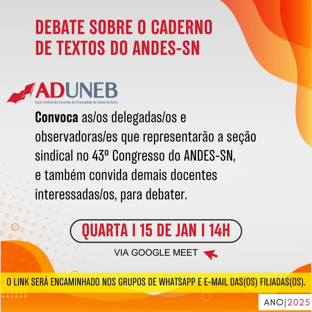 Para participar do debate que será realizado pela ADUNEB, sobre o Caderno de Textos do 43º Congresso do ANDES-SN, via Google Meet, nesta quarta-feira (15), às 14h, acesse o link https://meet.google.com/dpx-ubow-dim?authuser=1