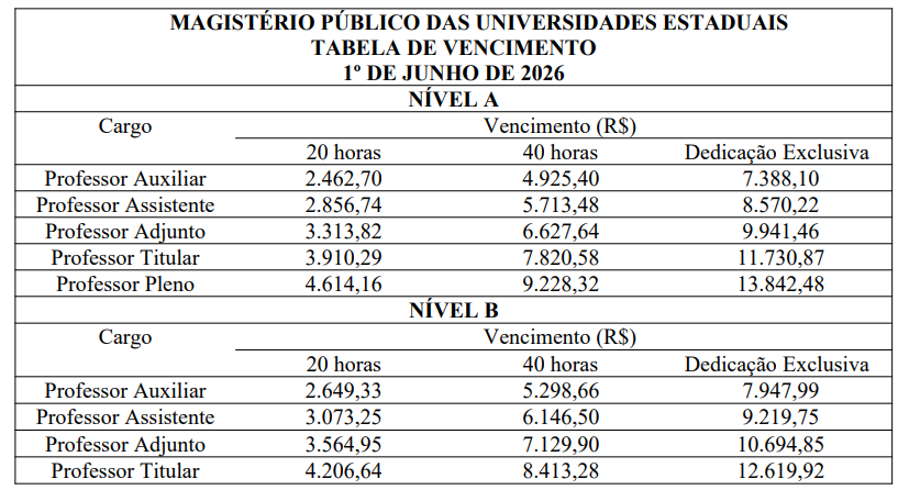 Conforme o acordado com o Fórum das ADs em mesa de negociação, os índices de reajustes salariais serão de 6,8% em 2025 e 6,6% em 2026, em quatro parcelas: 4,7% em janeiro/25, 2% em julho/25, 4,5% em janeiro/26 e 2% em junho/26, acumulando o total de 13,83% de recomposição salarial. A categoria acumulava perdas salariais na ordem de 35% desde 2015, mesmo com os últimos reajustes, segundo o Departamento Intersindical de Estatística e Estudos Socioeconômicos (DIEESE). A previsão é que a votação do PL de reajuste salarial aconteça ainda em 2024, agora no mês de dezembro.