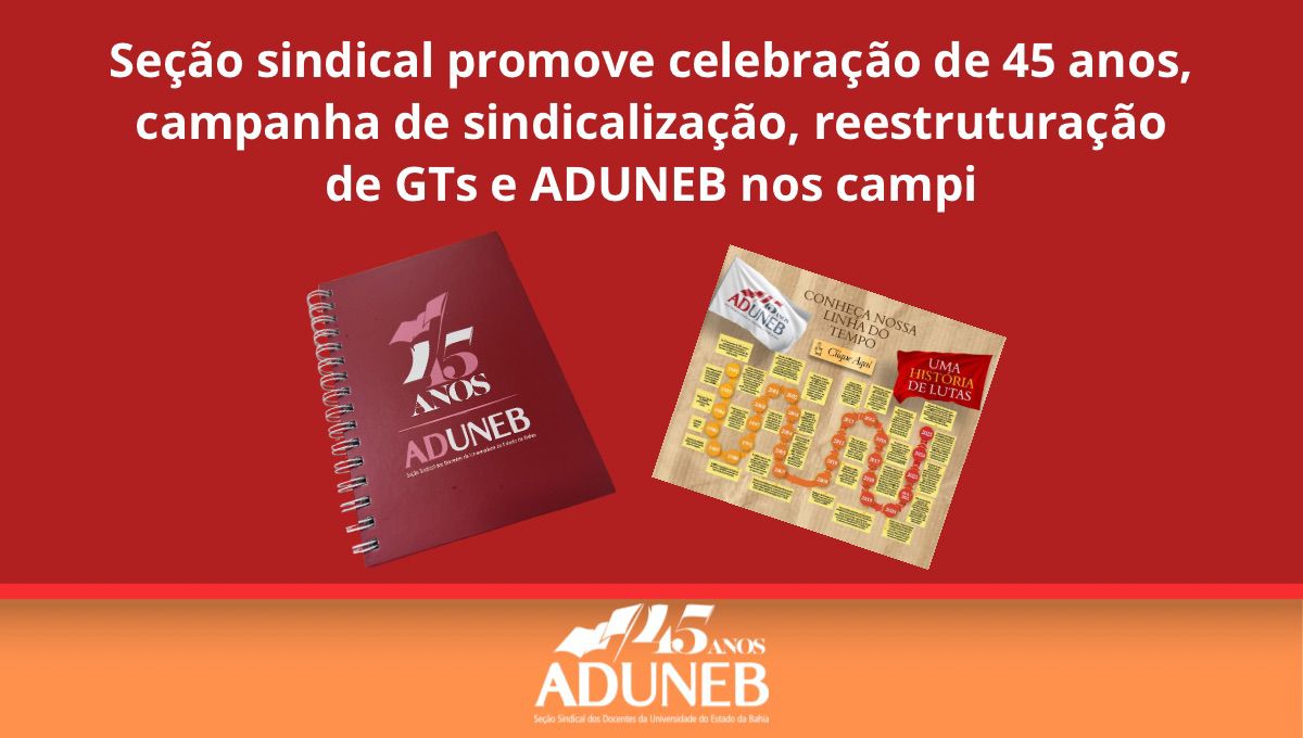 Para dar as boas-vindas às/aos docentes sindicalizadas/os e marcar as comemorações dos 45 anos do sindicato, a ADUNEB produziu cadernos alusivos à data com uma logo comemorativa, uma linha do tempo, imagens e informações que marcaram sua trajetória. Essa mesma linha do tempo teve uma versão em painel já instalada na entrada da sede, em Salvador, e uma versão interativa está disponível no site. A distribuição dos cadernos está sendo realizada pelas/os representantes sindicais da ADUNEB de cada departamento ou nos colegiados. A seção sindical está organizando o envio do material a cada campus.